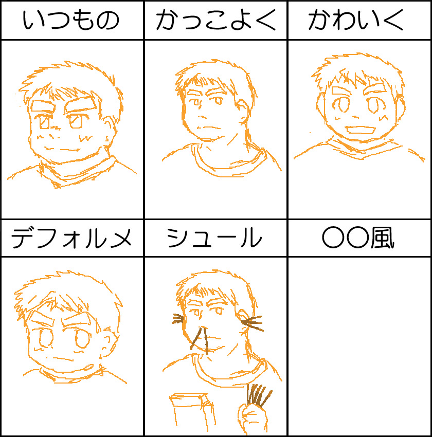 さぁいっぱい描くぞと意気込んだものの、マウスで描けるのは普段使いの表情と角度だけということに気付きました。うおお。